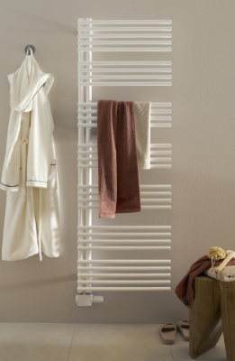Wer sein Bad renoviert, plant langfristig. Helle Farbnuancen und natürliche Steinoptiken sind zeitlos schön und kommen nie aus der Mode. Auch beim Thema Keramik bin ich Team Klassik – Weiß passt einfach immer. Eine offene Walk-in-Dusche wirkt großzügig und einladend. Chromfarbene Armaturen setzen einen kühlen Kontrast zur warmen Wandgestaltung. Trendsetter holen sich mit goldfarbenen Armaturen und passenden Profilen einen Hauch von Luxus ins Bad. Was ich in meinem Bad definitiv nicht missen möchte: einen Heizkörper, der die Handtücher vorwärmt.