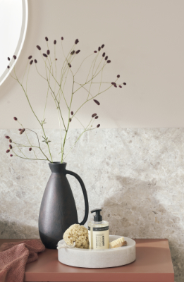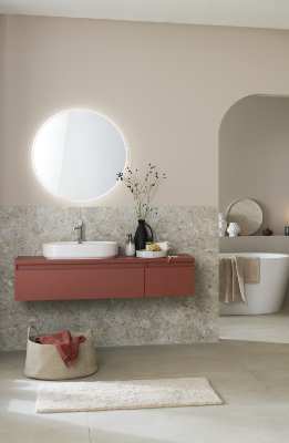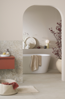 Es wird immer wohnlicher in der Nasszelle. Das, was wir im Wohnzimmer schön finden, hält jetzt auch im Bad Einzug. Nach neutralen Grautönen wird es farblich wieder wärmer im Bad: Weiche Erdtöne – vor allem im Zusammenspiel mit Creme-Nuancen – schaffen eine angenehme und wohnliche Atmosphäre. Terrakotta setzt ein modisches Highlight.