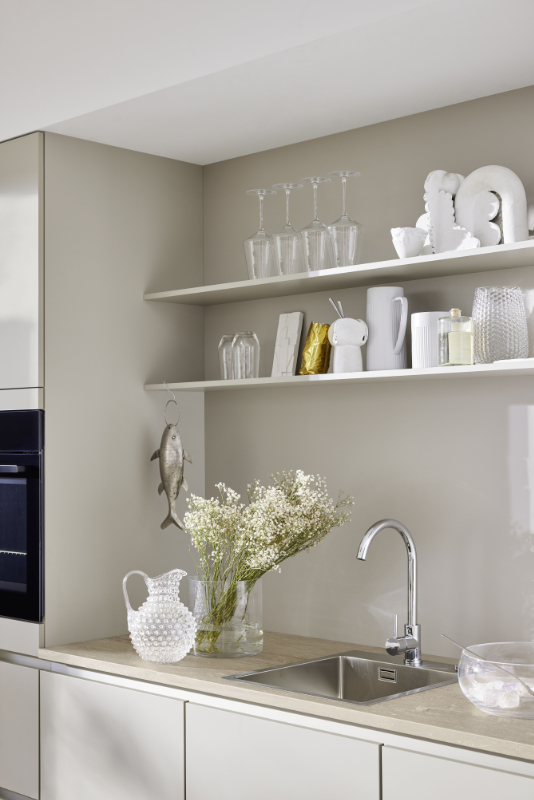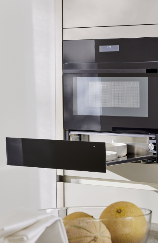 In der Wärmeschublade können die Teller vorgewärmt werden, damit das im Backofen zubereitete Essen beim Servieren nicht so schnell kalt wird. Offene Regalborde über dem Spülbecken geben der Küchenzeile einen luftigen und eleganten Look.