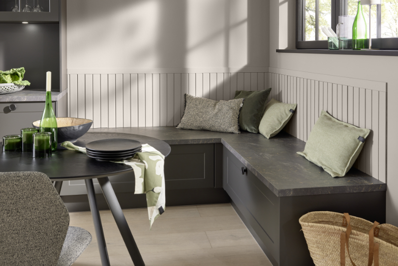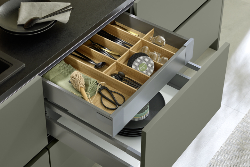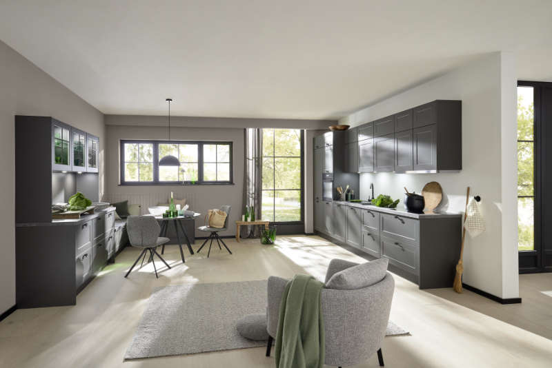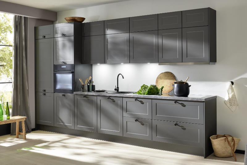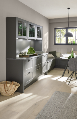 Edles Grafitgrau, Arbeitsplatten im Dekor Titian und schwarze Knopfgriffe holen das Design in die Moderne. Die Liebe zum Detail spiegelt sich dabei auch hinter den Fronten wider: Schubkasteneinsätze aus Holz sortieren das Besteck stilvoll und übersichtlich.