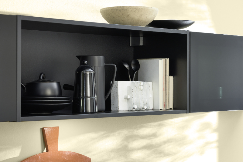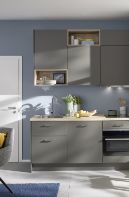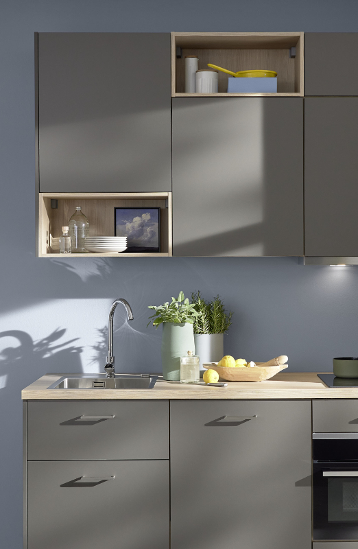 Die schmalen Oberschränke mit offenen Regaleinsätzen verstecken und präsentieren gleichermaßen. Besteckeinsätze aus Holz unterstreichen den edlen Designanspruch. Gut zu wissen: Alle Küchenmöbel sind individuell plan- und ausstattbar. Von der Frontfarbe über die Arbeitsplatte, von den Schrankmodulen bis zu verschiedenen Grifflösungen gestalten Sie Ihre Traumküche Schritt für Schritt mit.