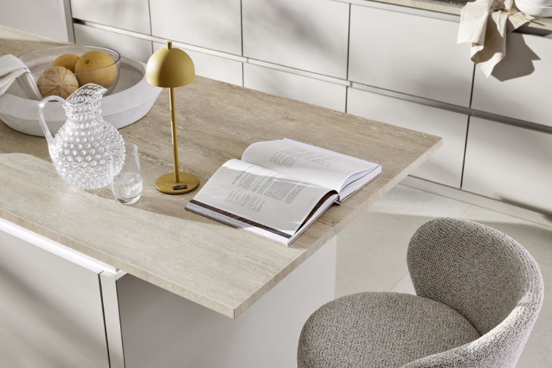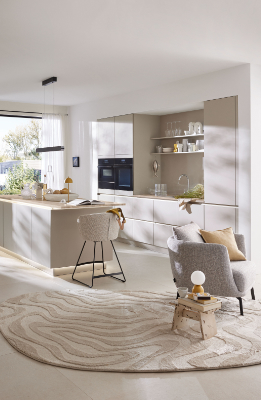 Der zeitlose Cremeton im Wohnbereich steht für Wärme und Behaglichkeit und setzt sich in der Küche anmutig fort. Kochen, Essen und Wohnen verschmelzen miteinander. Die Sockelbeleuchtung lässt den Küchenblock optisch fast schweben. Auch die Arbeitsplatte im Dekor Travertin hebt dank Griffmuldenbeleuchtung scheinbar vom Küchenblock ab. Ihr Überstand wird zum Tischchen, an dem der Barstuhl einen bequemen Sitzplatz bietet.