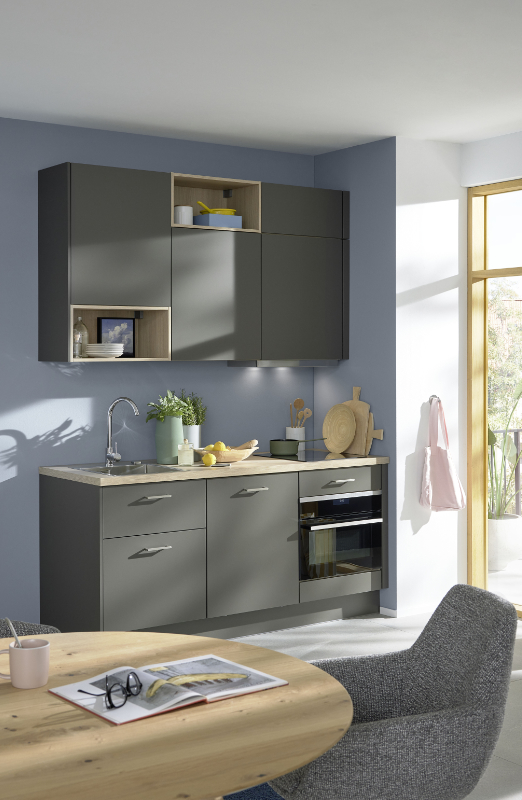 Je kleiner die Fläche, desto individueller die Lösung. Praktische Gadgets lassen dabei keine Wünsche übrig: Ein Mini-Geschirrspüler, ein kompakter Backofen, das Kochfeld und eine Spüle bieten alles, was Hobbyköch:innen glücklich macht. In den Oberschränken verschwinden Zutaten, Tassen und Gläser. Regaleinsätze öffnen die Schrankfronten optisch, steuern durch den Holzton wohnliche Wärme bei und bieten Accessoires eine hübsche Bühne.