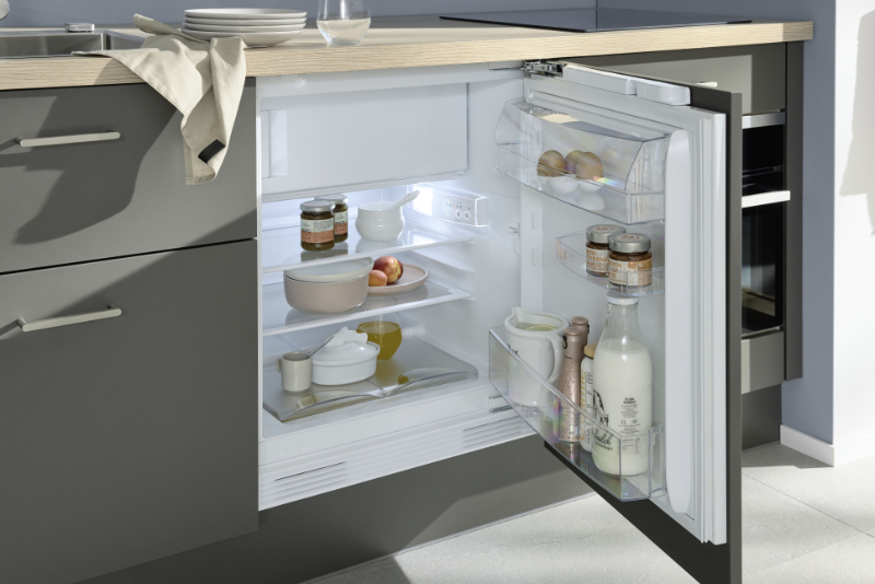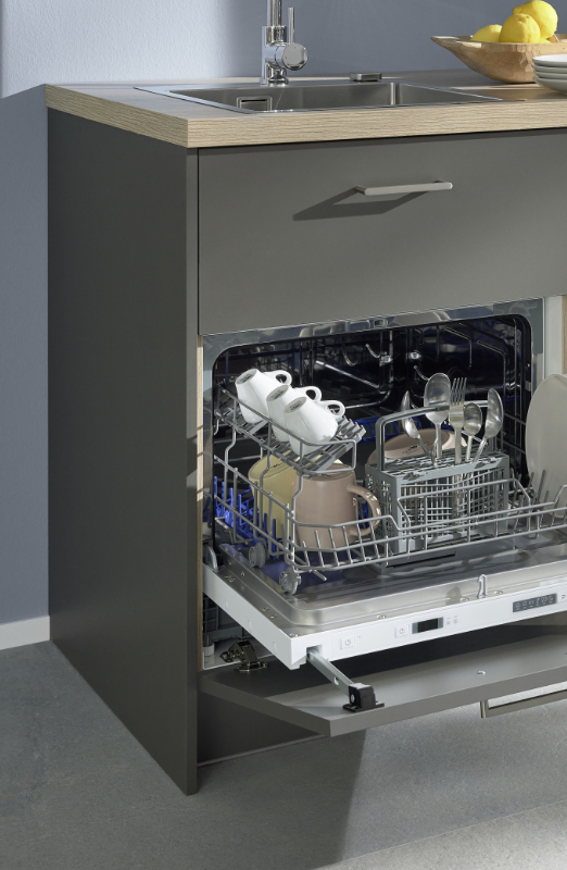 Im Kühlschrank mit Gefrierfach lagern die Vorräte ordnungsgemäß. Auch in der Besteckschublade mit Einsatz geht es ganz geordnet zu. So findet selbst in der Tiny-Kitchen alles seinen Platz.