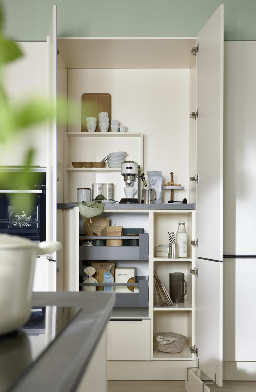Im großzügigen Wandschrank findet versteckt hinter Schranktüren auf einer Extra-Arbeitsfläche die Kaffeemaschine einen Stammplatz. Geschirr, Accessoires und Vorräte werden in Schüben und auf Borden drumherum gelagert. Schließt man alle Türen, ergibt sich ein ruhiges, aufgeräumtes Bild. So macht Ordnung halten Spaß! Ihr Grundriss ist zu klein für diesen Luxus? Auch für kleine Küchen gibt es kluge Ideen…