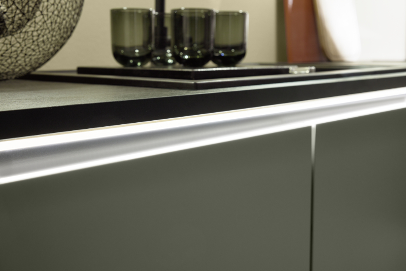 Mit betongrünen Fronten, einer schwarzen Arbeitsplatte mit Schieferstruktur und schwarzen Griffmulden mit Beleuchtung zeigt die Küchenzeile Gespür für Trends. Der Ofen auf Arbeitshöhe gehört ebenso zur praktischen Ausstattung wie ein Kochfeld mit integriertem Dunstabzug, eine Kühl-/Gefrierkombination und ein Geschirrspüler.