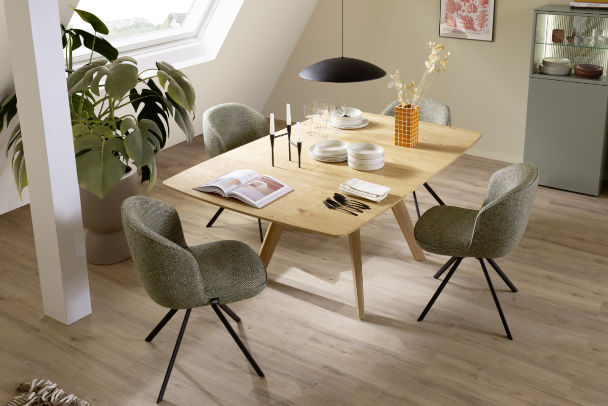 Bei vielen Modellen der SCHÖNER WOHNEN-Kollektion bestimmen Sie das Menü vom Untergestell bis zur Tischplatte selbst. Ob Holz- oder Metallbeine, eine Platte aus Wildeiche, Eiche rustico oder Eiche schwarz lackiert, aus satiniertem Glas oder einer Keramikausführung – Wünsch-Dir-Was gehört zum Standard. So finden Sie garantiert einen Esstisch, an dem Sie sich jeden Tag gern niederlassen.