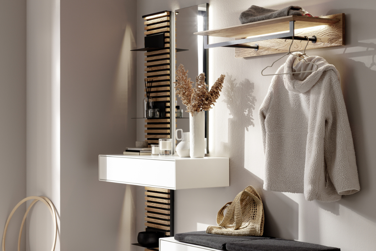 Der Flur heißt uns willkommen. Ob Fremde oder Freunde, Bekannte oder Nachbarn – öffnen wir die Haustür, blicken sie in den Flur. Er ist Empfangsraum, erster Anlaufpunkt und Durchgangszimmer. Gleichzeitig dient er als Schuhlager und Schlüsselbrett. Wir muten ihm Mützen und Schals, Fahrradhelme und Taschen zu. Ganz schön viel auf wenig Raum. Die individuell kombinierbaren Garderoben- und Stauraum-Elemente der SCHÖNER WOHNEN-Kollektion schaffen Ordnung und sorgen mit außergewöhnlich schöner Optik und hervorragender Qualität jeden Tag dafür, dass Sie gern nach Hause kommen. Vom Schuhkipper bis zum Spiegel, von der Wandgarderobe bis zur Sitzbank – jedes Möbelstück wird mit viel Liebe zum Detail in Deutschland gefertigt. Das sieht man nicht nur, das spürt man auch. Also immer hereinspaziert, liebe Gäste!